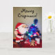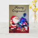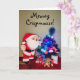 Um gato de pelúcia laranja em um terno de Papai noel ao lado de uma minúscula árvore de Natal coberta em brinquedos de gatos deseja (ou seus gatos) um rato meowy Crispmouse. O texto é personalizável.