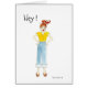 Uma menina de pé com as mãos sobre os quadris com uma atitude. Ela está vestindo uma capa amarela curta com jeans azuis. Ela veste seu cabelo vermelho brilhante em um rabo de cavalo em cima de sua cabeça.