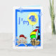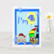 4.º cartão de aniversário com pirata e nave engraçada, palhaço, pinguim e balões, num fundo azul. Personalize facilmente este design, adicionando ou alterando o texto.