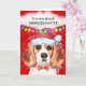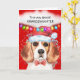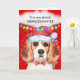 Um belo beagle de cor branca e macia, com orelhas longas de disquete, está vestindo um chapéu vermelho e branco fofo de Santa e uma gravata vermelha de arco. Ele é emoldurado por brilho falso; um fundo vermelho e uma bolha branca de fala e luzes de cordas de Natal multicoloridas penduradas abaixo da bolha. A mensagem dentro diz: "Desejando-lhe um Natal festivo e alegre. Enche meu coração de alegria, felicidade e amor. Amo-te à lua e de volta! Tenham um feriado feliz! O membro externo da família e a saudação do dentro podem ser alterados para qualquer um para atender às suas necessidades.