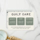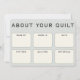Uma colcha é um trabalho de amor, e muitas vezes se torna uma herança familiar. Quando você oferecer uma colcha, use esta carta para ajudar o receptor a aprender a cuidar da sua nova colcha precioso! As listas melhoram quando são amadas, e este cartão encorajará o seu destinatário a usá-lo. A frente do cartão diz como lavar, secar e armazenar sua nova colcha. A parte de trás da carta tem espaço para o fabricante escrever informações importantes sobre a colcha: por quem ela é feita, onde ela é feita, quando foi feita, com que padrão ela foi feita, colagem de detalhes e detalhes materiais.
