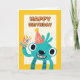 Um bom cartão de saudação de quinto aniversário para uma criança. Um personagem sorridente está vestindo um chapéu de aniversário e segurando um pedaço de bolo de aniversário com cinco velas para o evento especial de 5. Arte, imagem e direitos de autor versos © Shoaff Ballanger Studios, 2022.