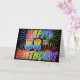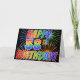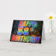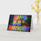 A frente desta vibrante, atraente e divertida design de carta de saudação apresenta um padrão colorido inspirado por fogos de artifício celebratórios, juntamente com a mensagem "HAPPY 58TH BIRTHDAY!" tendo um arco-íris multicolorido como um padrão de gradiente, em um fundo preto colorido. O dentro apresenta uma mensagem de saudação personalizada, ou talvez possa ser apagado e deixado o vazio se uma mensagem for escrita manualmente. Um cartão de boas-vindas como este pode ser uma forma feliz e divertida de celebrar o 58.º aniversário de alguém. [~Z0000355]