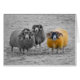 Três Barragens Escocesas posando para a câmera. Duas ovelhas negras e brancas com um carneiro solteiro amarelo-alaranjado com chifres muito encaracolados.