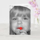Uma garotinha bonita vestindo um chapéu e aplicando batom vermelho para o aniversário. Todo o texto pode ser alterado.