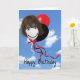 Rosto sorridente da garota com cabelo num balão de aniversário branco e fundo do céu. O plano de fundo pode ser alterado.
