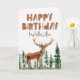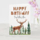 Cervo único, pinheiros e cartão de aniversário com letras de madeira -feliz aniversário-. Personalizável!