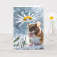 Rato branco bonito segurando uma margarida branca na neve para o aniversário. O texto é editável.