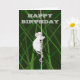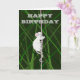 Um rato de cinza, num campo de grama verde alta, subindo um galho, sua longa cauda envolta no galho para apoio. A mensagem na dentro do cartão diz: "Tenha um aniversário maravilhoso, alcance as estrelas! "