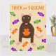 Este cartão incrível apresenta uma imagem gráfica de um ratinho marrom fofo com orelhas, cauda e pés cor-de-rosa. O rato está segurando uma abóbora laranja entre suas patas. Há uma coleção de doces verdes, roxos e laranjas em torno do pequeno rato. Este design é perfeito para qualquer amante ou dono de rato neste Halloween.