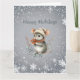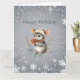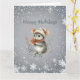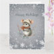Um rato cinza fofo vestido para o inverno com um gorro e cachecol segura frutas e deseja-lhe “Boas Festas.” Ele está cercado por um desenho de floco de neve branco. O cumprimento pode ser facilmente alterado para o que você preferir.