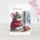Um camundongo pequeno vestindo um suéter de malha vermelha se senta por uma janela gelada com uma xícara de cacau cozido com padrão de floco de neve O texto do dentro pode ser mudado.