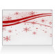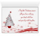 Rato bonito de desenho animado com um chapéu de Papai Noel segurando um presente atrás de suas costas. A dentro tem uma árvore de Natal branca com ornamentos vermelhos e todos estão sobre um fundo branco com traços vermelhos de neve, o que faz com que um cartão de saudação de Natal muito bonito, divertido e festivo seja design.