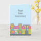 Cartões "Feliz Aniversário Doméstico" para marketing imobiliário. A design apresenta um bairro urbano fofo sobre um fundo azul claro. Perfeito para imóveis residenciais, mutuantes hipotecários, agências de títulos, serviços de inspeção no domicílio, etc.