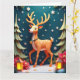 Um encantador design de arte 3D com uma rena graciosa vestindo um colar de ouro. Cercado por pinheiros de papel em camadas, lanternas brilhantes, e flocos de neve brilhantes, esta trabalho de arte festiva captura a magia do crepúsculo de Natal. Perfeito por adicionar um toque de floresta quente aos seus cartões de natal.