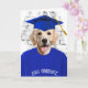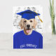 Cachorro recuperador de ouros em camiseta azul e chapéu de graduação azul para parabéns formandos.