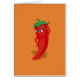 Um personagem de desenho animado de pimenta vermelho e quente. Design original com fundo laranja. Cartão de saudação personalizado.