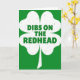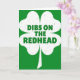 This card features a large white four-leaf clover centered on an emerald green background, giving it a classic St. Patrick’s Day look ☘️. Inside the clover, the phrase “DIBS ON THE REDHEAD” appears in dark green, set in a sturdy sans-serif style that stands out clearly against the white. The words are stacked in three lines and centered within the clover’s rounded leaves, like a cheeky claim meant to make a friend laugh or catch a partner’s eye 💚. The simple layout feels like a lighthearted toast at a crowded pub, where someone leans in close and says it with a grin. Both the green backdrop and the white clover have a speckled, worn texture that adds depth and a slightly vintage, screen-printed feel. Tiny darker flecks scatter across the white clover while lighter breaks and grain soften the solid green field. The clover’s stem points downward from the center, and the roughened edges and scattered speckles give the whole design a gently weathered finish.