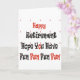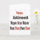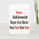 Cartão de Saudação para uma pessoa que vai se aposentar. Feliz aposentadoria Espero que você se divirta" Letras negras e vermelhas.