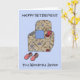 Uma poltrona com padrões, com pantufas na sua frente e uma caneca e um controle remoto nos braços da cadeira. A imagem tem um fundo azul pastel e as palavras 'Feliz Reforma a um Maravilhoso Janitor'.