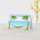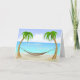Felicite a aposentada com este cartão de boas-vindas com uma rede amarrada entre duas palmeiras com areia, mar e fundo do céu.