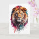 Retrato de leão macho em aquarela com arte de respingos vermelhos, amarelos, verdes e roxos. Cartão de cumprimentos em branco para aniversário, aniversário de casamento, novo bebê, agradecimento, condolências, etc.