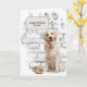 Ouro com baseball e luva no fundo do muro de tijolos resfriado para o aniversário. A mensagem na bolha de fala pode ser editada.