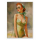 A nostalgic watercolor fashion illustration evoking the 1950s–60s, featuring a poised woman lounging at the beach. She wears a pale lime-green vintage one-piece swimsuit, a matching headband, a chic neckerchief, and round green-tinted sunglasses. Her auburn pin-up waves, bold red lipstick, and relaxed, confident pose capture mid-century glamour. Soft, translucent washes in warm beiges, greens, and yellows create an atmospheric, sunlit backdrop with hints of sand, enhancing the timeless, elegant mood.