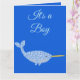 Este incrível cartão revela uma imagem de arte digital de um lindo bebê azul, Narwhal. O corpo principal do Narwhal tem textura áspera e é azul enquanto o ventre é azul de cinza. O Narwhal tem um olho preto com um aluno branco e uma buzina de ouro brilhante no rosto. Também tem cauda delicada e nadadeiras. Uma maneira fofa de revelar o gênero do bebê.