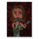 Uma imagem digital de uma estrela rock queimada criada de um desenho a lápis. O músico está tocando violão verde e tem cabelo castanho e pele rosada. O personagem de desenho animado tem grandes lábios e círculos escuros à volta dos olhos. O fundo é um vermelho escuro queimado com espirais de preto e um sutil efeito de zoom.