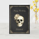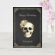 Cartão de aniversário elegante do crânio Gótico com um dentro de mensagem personalizado. Design apresenta um crânio floral gótico em um quadro de ouro no estilo vintage em um fundo de textura preta. O crânio é acentuado por lindas rosas brancas. É uma forma excelente de desejar um feliz aniversário a uma garota gótica que ama o misterioso e mais negro lado da vida.