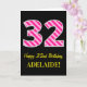 A frente desta divertida e simples design de cartões de saudação com tema de aniversário apresenta um grande número "32" com um padrão de cor-de-rosa-escuro e listras de rosa claro, juntamente com a mensagem "Feliz 32º aniversário", e um nome personalizável. O fundo da frente é preto colorido. O dentro apresenta uma mensagem de saudação de aniversário personalizável, ou talvez possa ser apagado e deixado o vazio se uma mensagem for escrita manualmente. Um cartão de aniversário personalizável como este pode ser uma maneira divertida de reconhecer o trigésimo segundo aniversário de alguém. [~Z0000377]