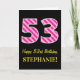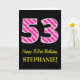 A frente desta divertida e simples design de cartões de saudação com tema de aniversário apresenta um grande número "53", com um padrão cor-de-rosa escuro e listras de rosa claro. Também apresenta a mensagem "Feliz 53º Aniversário", e um nome personalizável. O fundo da frente é preto colorido. O dentro apresenta uma mensagem de saudação de aniversário personalizada, ou talvez possa ser apagado e deixado o vazio se uma mensagem for escrita manualmente. Um cartão de aniversário personalizado como este pode ser uma maneira divertida de enviar uma mensagem em comemoração dos cinquenta e três anos de alguém. [~Z0000377]