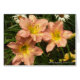 Um trio bonito da flor do hemerocallis do Hemerocallis do rosa do pêssego com gargantas e a crosta de torta amarelas ruffled bordas da pétala, variedade "carrilhão distante". Esta foto foi recolhida meus antigos jardins quando eu vivi em Massachusetts. Eu tive sobre 1000 variedades diferentes do hemerocallis (há sobre 80.000 variedades registradas com a sociedade americana do Hemerocallis), assim como muitos outros perennials, anuários, arbustos e árvores. Você pode igualmente obter etiquetas e selos postais de harmonização de endereço! Direitos reservados originais 2007 da fotografia por Karen Coffelt.