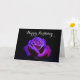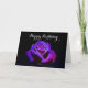 Um lindo cartão de feliz aniversário. Uma foto incrível de uma rosa roxa com iluminação incrível que acentua os destaques das cores azul e rosa nas pétalas desta rosa. Um fundo preto contrastado com a iluminação realmente mostra a beleza desta flor, que está coberta por delicadas gotículas de água.