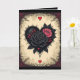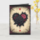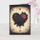 Um coração ousado, gótico e preto-tinta, com uma delicada borda. Aninhadas dentro desse coração estão duas rosas. Pequenos botões vermelhos e folhas escuras se espalham ao redor delas, criando um contraste dramático com a suavidade das pétalas. O clima geral é ricamente romântico com uma borda escura e agridoce. Uma moldura ornamentada emoldura tudo: videiras onduladas, filigranas espinhosas e floreios simétricos nos cantos em vermelho profundo e preto que parecem ao mesmo tempo decorativos e ligeiramente ameaçadores. Pequenos corações vermelhos pontuam o design acima e abaixo do motivo central.