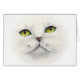 Um retrato suave e próximo de um gato persa branco com olhos verdes gritantes.