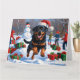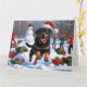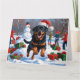 Cartão Rottweiler correndo em neve com chapéu de Natal