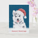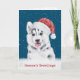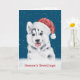 Cachorro rouco com chapéu de Papai Noel de Natal em flocos de neve em fundo azul. A cor de fundo pode ser alterada. O texto pode ser editado ou excluído.