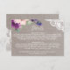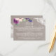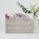 Este roxo floresce e o cartão da inserção dos detalhes do casamento do laço é perfeito para um casamento do país. As características de design chiques rústicas um arranjo bonito do roxo da ameixa, lilac e coram flores cor-de-rosa com laço floral branco em um fundo de linho elegante.