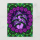 Um cartão com os cinco cogumelos roxos contra um fundo do preto, o azul escuro e o roxo do redemoinho. O design é circular, e tem uns motivos florais roxos mais claros cercar os cogumelos. Atrás do design roxo são os motivos verdes ornamentado.