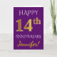 Este simples e personalizado design de cartão de felicitações de aniversário de casamento apresenta a mensagem "FELIZ 14º ANIVERSÁRIO", com o "14º" tendo uma aparência semelhante ao ouro. A frente também apresenta um nome personalizado e um fundo roxo. O interior apresenta uma mensagem de felicitações de aniversário de casamento personalizada. Pode ser dado ao marido ou à esposa em celebração do décimo quarto aniversário de casamento do casal. [~Z0000089]