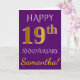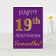 Este simples design de cartão de aniversário de casamento personalizado apresenta a mensagem "FELIZ 19º ANIVERSÁRIO", com o "19º" tendo uma aparência semelhante ao ouro falso. A frente também apresenta um nome personalizado e um fundo roxo. O interior apresenta uma mensagem de aniversário de casamento personalizável. Pode ser dado a um marido ou uma esposa em celebração do décimo nono aniversário de casamento do casal. [~Z0000089]