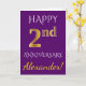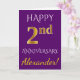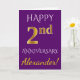 Este simples design de cartão de aniversário de casamento personalizado apresenta a mensagem "FELIZ 2º ANIVERSÁRIO", com o "2º" tendo uma aparência semelhante ao ouro falso. A frente também apresenta um nome personalizado e um fundo roxo. O interior apresenta uma mensagem de aniversário de casamento personalizada. Pode ser dado a um marido ou esposa em celebração do segundo aniversário de casamento do casal. [~Z0000089]