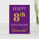Este simples design de cartão de aniversário de casamento personalizado apresenta a mensagem "FELIZ 8º ANIVERSÁRIO", com o "8º" tendo uma aparência semelhante ao ouro falso. A frente também apresenta um nome personalizado e um fundo roxo. O interior apresenta uma mensagem de aniversário de casamento personalizada. Pode ser dado a um marido ou esposa em celebração do oitavo aniversário de casamento do casal. [~Z0000089]
