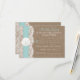 A coleção de casamentos de praias de areia turquesa e dólar é um design impressionante que apresenta um adorável fundo de efeito de burvolta rústica com uma trim romântica de efeito de renda branca vintage terminada com uma fita de areia e de turquesa impressionante. Essas cartas de RSVP podem ser personalizadas para sua ocasião especial e podem fazer as cartas de inserção perfeitas para um casamento, chá de panela, festa de noivado, festa de aniversário e muito, muito mais. *Observe que o Zazzle só vende convites impressos para que esses convites não tenham nenhum material real de burlap, renda, dólar de areia ou fita.
