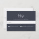 Cartões RSVP de casamento azul de cor simples e marinho. Recursos minimalistas do estilo design, script simples "Rsvp" em branco. A placa apresenta duas linhas de texto de modelo para nomes e data na parte traseira. Parte de uma coleção.
