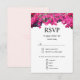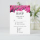 Cabeçalho floral vermelho magenta em placas RSVP de Casamento Branco. O verso tem fundo rosa de ouro leve. As flores Bougainvillea são acolhedoras e bonitas. Placas de Casamento Floral modernas.