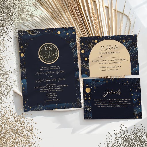 Celebrar sob as estrelas com este cartão de casamento celestial. Com um luxuoso céu noturno de marinho, com estrelas douradas a brilhar, e um roteiro romântico moderno, é a combinação perfeita para os seus convites noturnos estrelados. Personalize com seus detalhes de resposta e preferências alimentares para uma celebração inesquecível. Precisa de ajuda para personalizar ou combinar peças? Envie um email para bpkolman@gmail.com para obter assistência amigável.