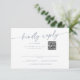 Este cartão de código de QR rsvp de boho chic slate blue mail in é perfeito para um casamento minimalista. A pálida design boêmica azul e branca, moderna, apresenta caligrafia rustica simples com um estilo único, mas clássico. Dê aos seus convidados a opção de enviar mensagens no seu cartão rsvp ou simplesmente responda on-line com este cartão de resposta de código QR. Digite seu endereço na seção de código QR do modelo e o código QR será atualizado automaticamente e vinculado ao seu site.